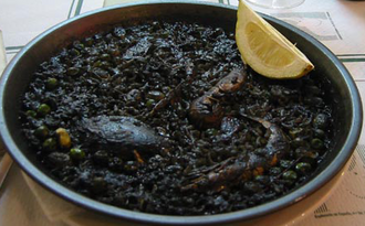 This is Paella arroz negra.  It is very delicious!!  The coloring is derived from squid ink.  There are various forms of paella for you to choose from.